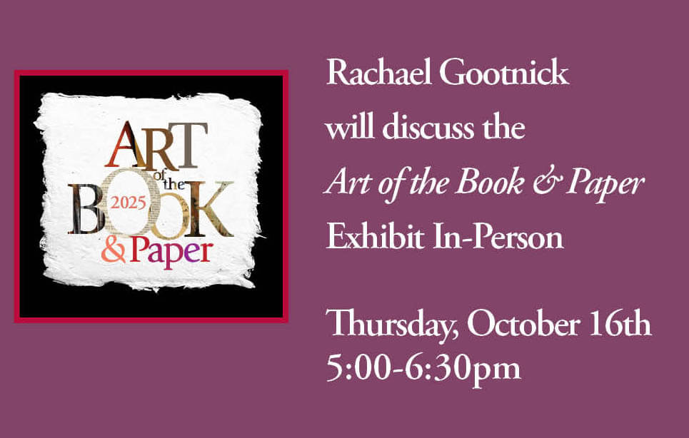 Join Rachael Gootnick and local book artists on Thursday, October 16th for an informal discussion of the ‘Art of the Book & Sculpture’ exhibit. Get an up close and personal look at the artwork in the exhibit.